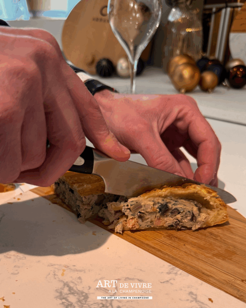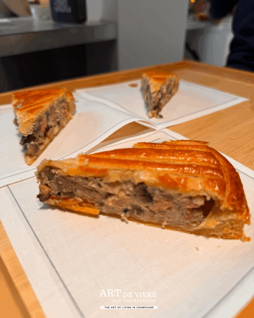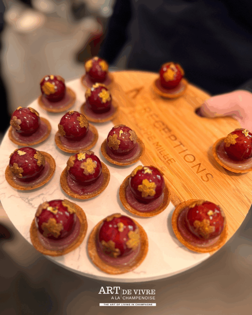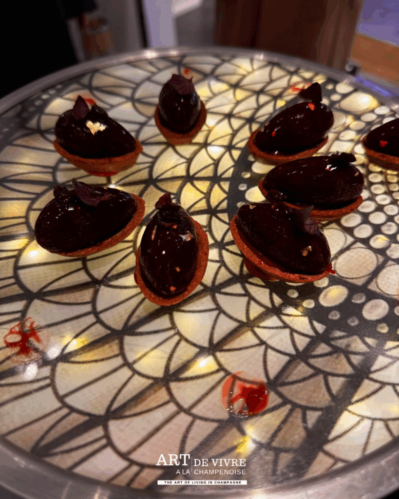 Sur les plateaux précommandés, les pièces apéritives prennent l’allure de bijoux gourmands : bulles de foie gras, miroir de betterave, perle de homard, robe de poireau… pensées pour faire briller les premiers instants du réveillon. Viennent ensuite des plats signature tels que la Tourte du Centenaire ou le Vol-au-vent des Sacres — clin d’œil à l’histoire rémoise.