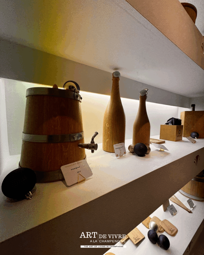 Mais l’un des projets les plus singuliers réside dans sa collaboration complice avec Jérôme Viard, fondateur de la Tonnellerie de Champagne. Ensemble, ils réinventent l’usage du bois de chêne — ce matériau noble du monde viticole — pour créer des vinaigriers et accessoires qui prolongent la mémoire du vignoble jusque sur les tables de fête. Une démarche engagée : redonner vie aux chutes de merrain, transformer les gestes du vin en art du quotidien.
