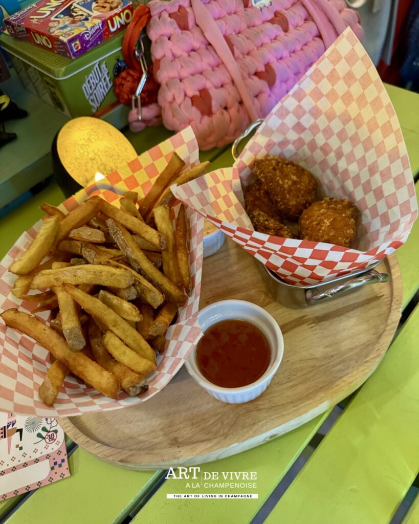 Les planches gourmandes, tapas et frites maison trouvent naturellement leur place sur les tables, dans cet esprit de cuisine conviviale que l’on aime retrouver lors des longues soirées entre amis.