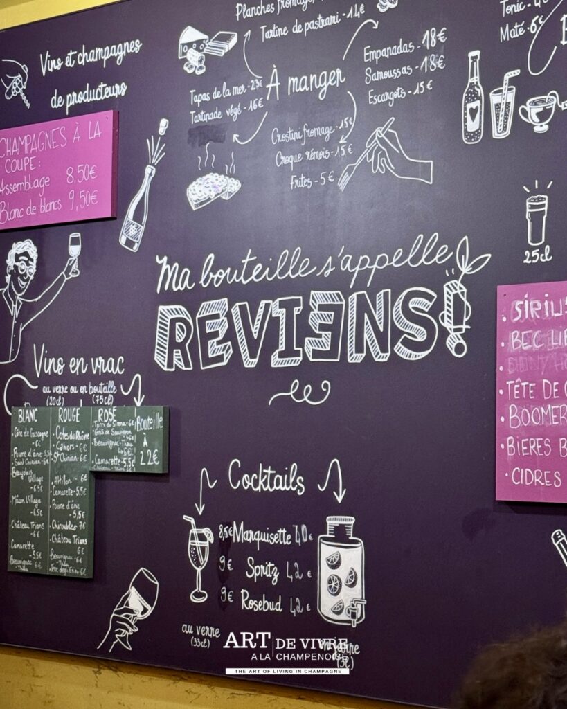 À Reims, certaines adresses ne cherchent pas à impressionner : elles séduisent naturellement, par leur âme, leur atmosphère et ce supplément d’authenticité qui donne envie de revenir. C’est exactement l’esprit de Ma Bouteille s’appelle Reviens, bar à manger à Reims devenu au fil des mois l’un des repaires les plus conviviaux du boulevard du Général Leclerc. À deux pas de la place d’Erlon, cette adresse singulière cultive un art de vivre simple, joyeux et terriblement attachant, entre vins bio, assiettes généreuses, décoration dépareillée et ambiance résolument décontractée.