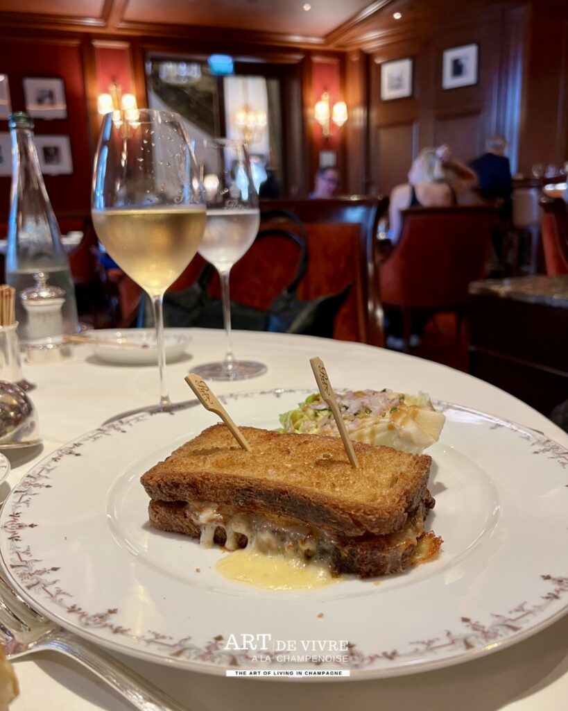 Le temps d’un déjeuner, bien qu’il soit possible d’y retrouver d’autres plats pour le lunch, la proposition se veut simple en apparence : un burger ou un croque-monsieur. Mais ici, la simplicité devient exercice de style. Les produits sont sélectionnés avec exigence, les cuissons précises, les équilibres justes. Et surtout, l’accord choisi avec les champagnes Barons de Rothschild apporte cette vibration supplémentaire, cette fraîcheur structurée qui élève l’ensemble sans jamais le dominer. Un service hors-pair, par Florian Guilloteau, Directeur de la Sommellerie.