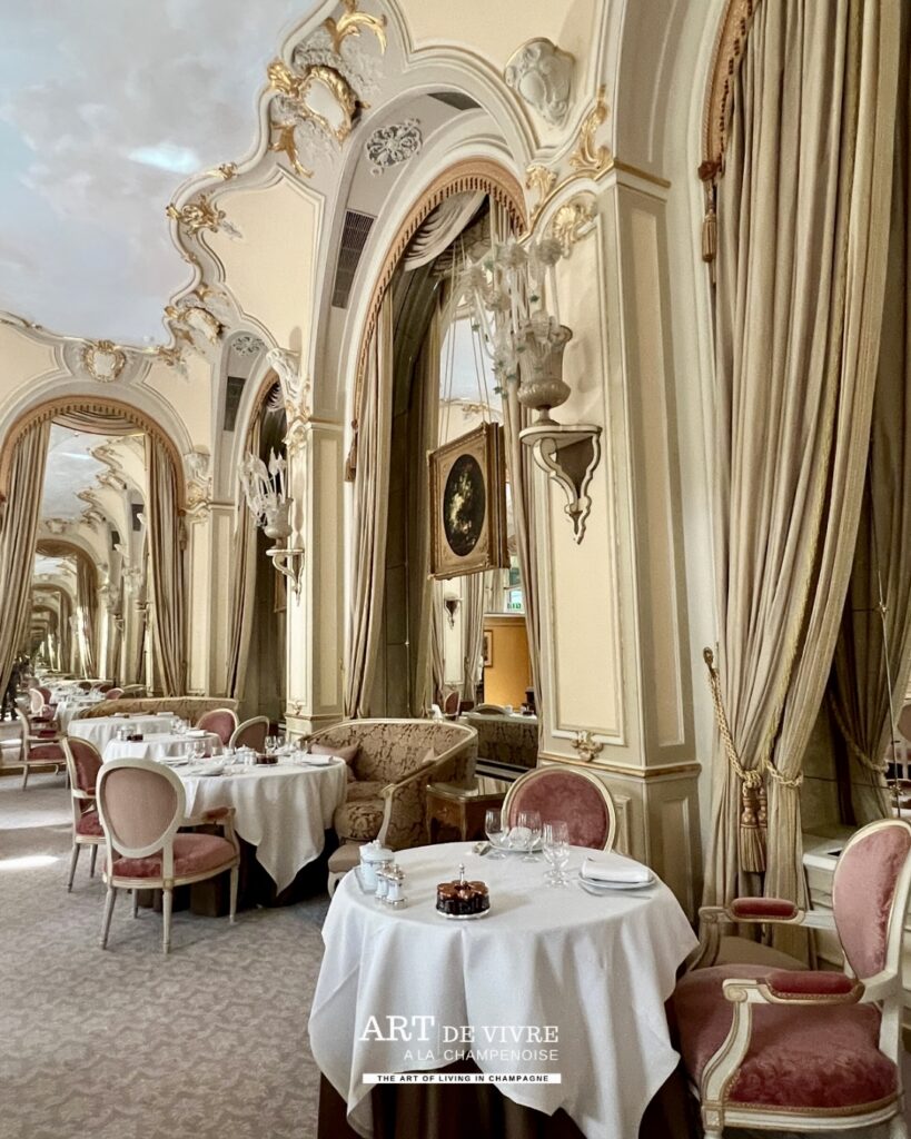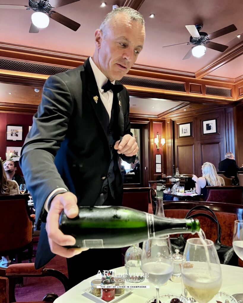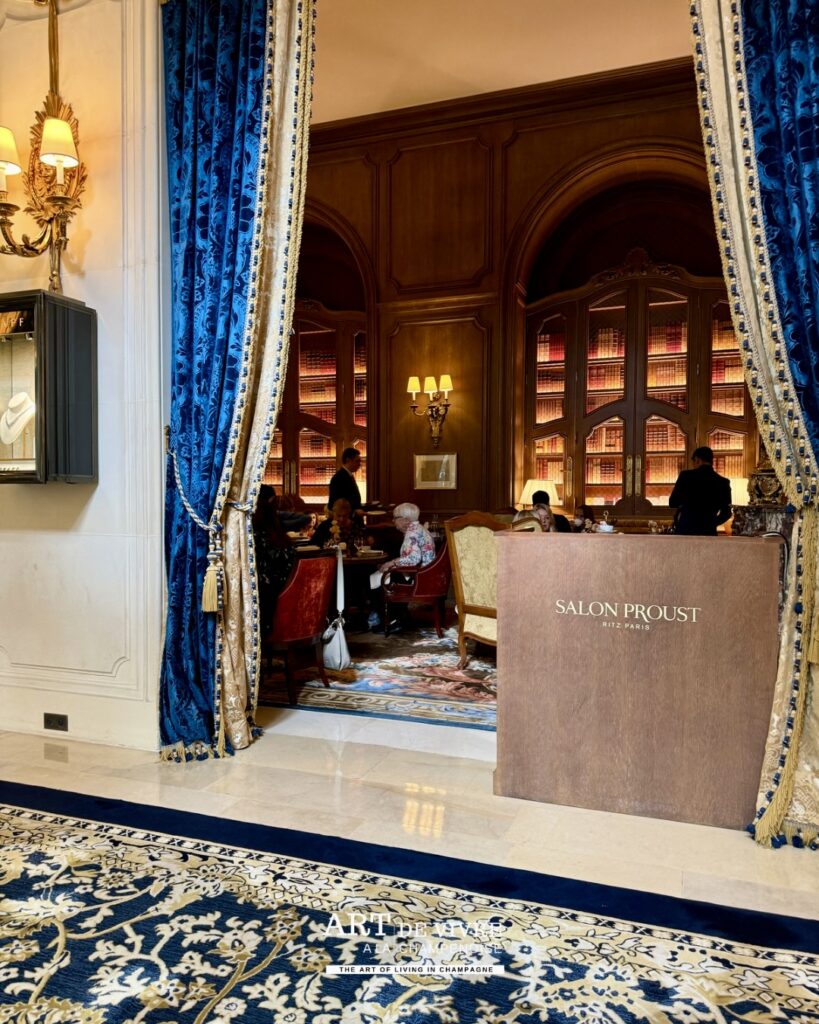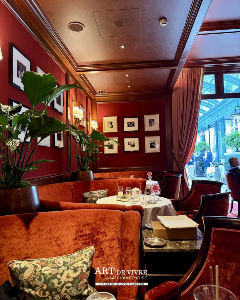 L’après-midi, le Ritz déploie une autre facette de son identité. Le goûter devient un rendez-vous à part entière : sélection de thés, cafés parfaitement exécutés, pâtisseries d’une grande finesse… et toujours cette possibilité d’y associer une coupe de Champagne. Une continuité logique, presque évidente, pour prolonger l’expérience avec légèreté.