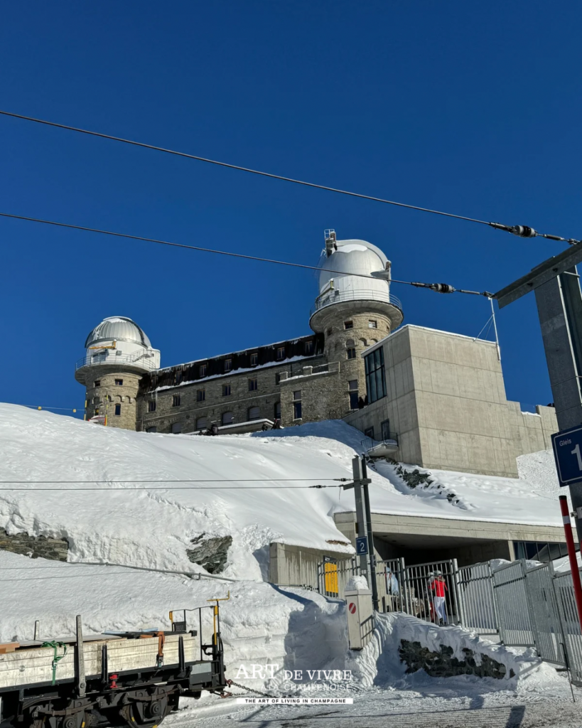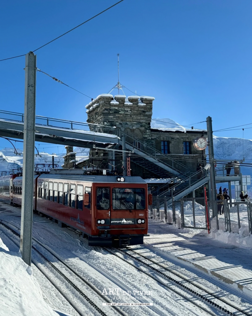 Chaque virage dévoile un tableau vivant. Les forêts enneigées, les chalets et demeures luxueuses, puis l’immensité minérale des cimes. À l’arrivée, la vue à 360° sur les Alpes suisses laisse sans voix. Un moment à savourer, tout comme une grande cuvée partagée quelques heures plus tôt.