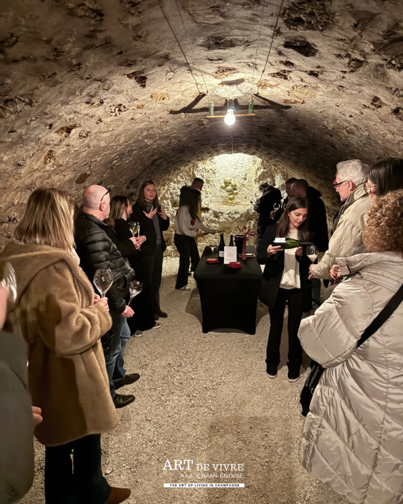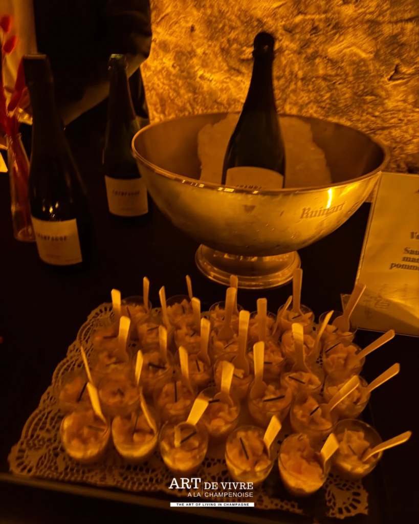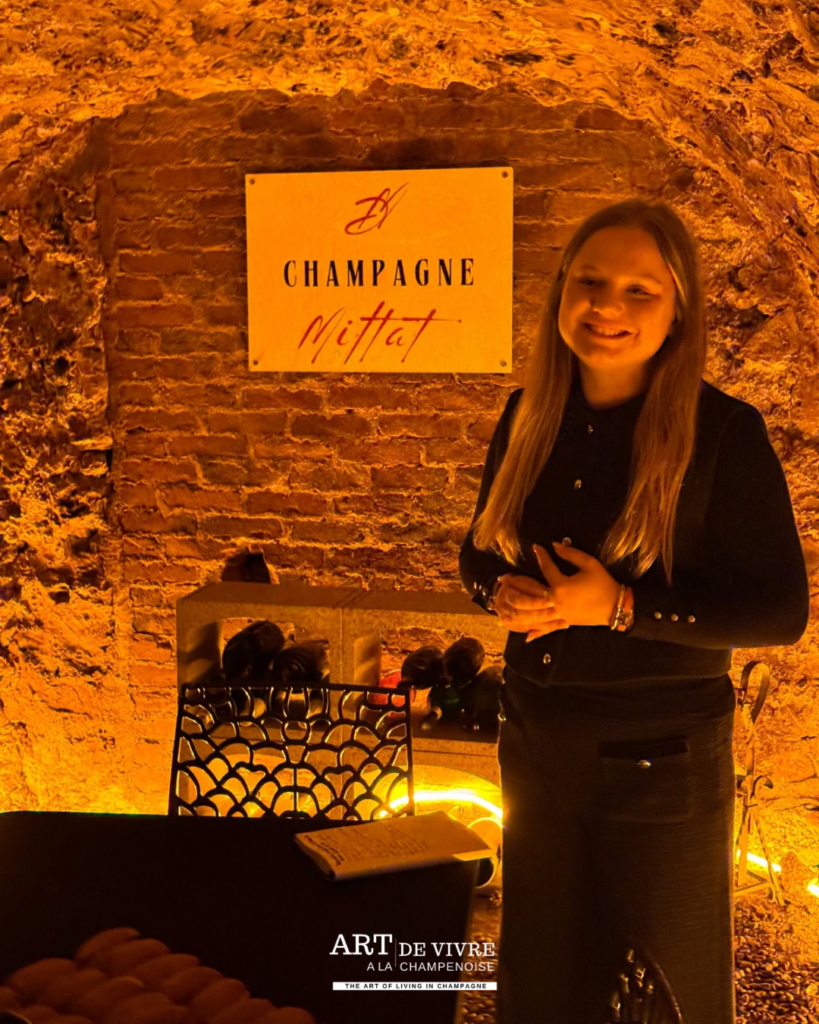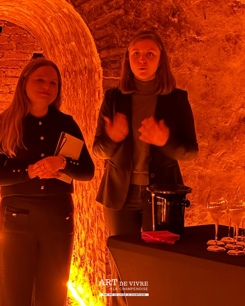 À l’occasion du lancement de la cuvée au Domaine Miltat, les deux sœurs ont imaginé une dégustation immersive en trois temps, au cœur même des galeries. Une expérience sensorielle pensée comme un dialogue entre le vin et le lieu. Salivant d’abord, soyeux ensuite, puis marqué par une longueur en bouche affirmée, le champagne révélait successivement ses nuances, accompagné de bouchées conçues pour en souligner la personnalité.
