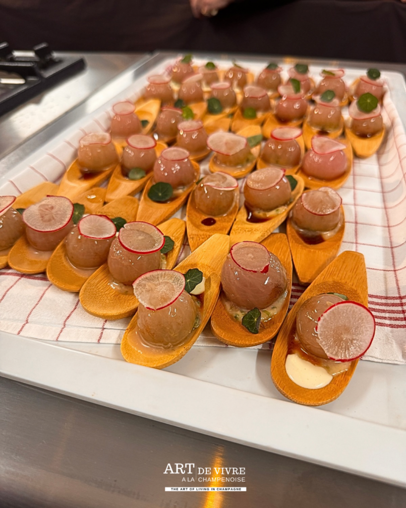 Les Habits de Saveurs, c’est aussi un ballet parfaitement orchestré. Chefs étoilés, vignerons de l’avenue de Champagne et producteurs locaux unissent leurs savoir-faire pour proposer des accords imaginés spécialement pour l’événement. Chaque préparation devient un prétexte à raconter un produit, un terroir, une histoire, sous les yeux d’un public curieux et attentif.