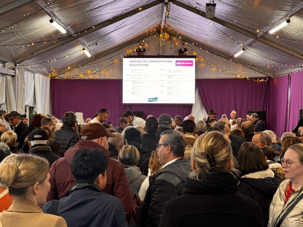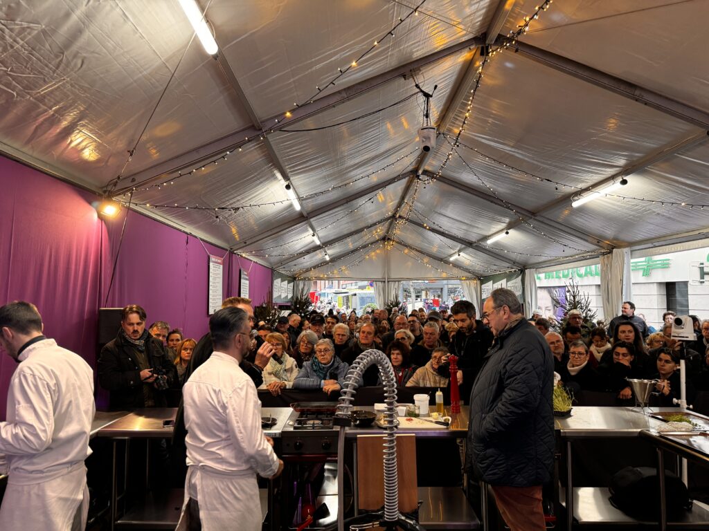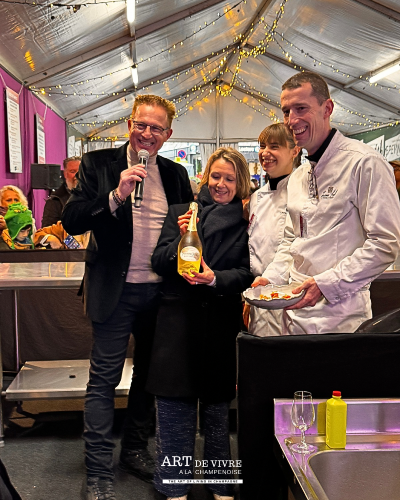 À proximité du Marché couvert, une foule nombreuse s’est rassemblée pour assister à ces démonstrations-dégustations ouvertes à tous. Sur scène, les chefs cuisinent en direct, échangent, expliquent leurs gestes et composent une recette originale pensée autour d’une cuvée de Champagne. Le public observe, écoute, réagit, et se laisse porter par l’ambiance chaleureuse qui règne tout au long de la matinée.