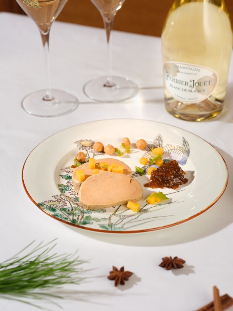 Dans cet écrin Art Nouveau, le foie gras se pare d’un voile de champagne Perrier-Jouët, d’une tuile en forme d’anémone, et d’un chutney de mangue aux épices, en accord parfait avec les cuvées Blanc de Blancs et Belle Époque 2016.