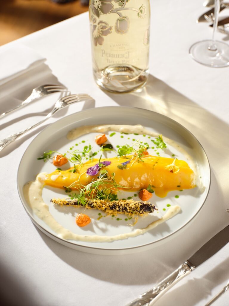 L’expérience débute autour de la cuvée Blanc de Blancs, servie avec une langoustine rôtie aux graines de sarrasin, puis se poursuit avec un blanc de Saint-Pierre au suc d’orange et curcuma, sublimé par la Belle Époque Blanc de Blancs 2017.