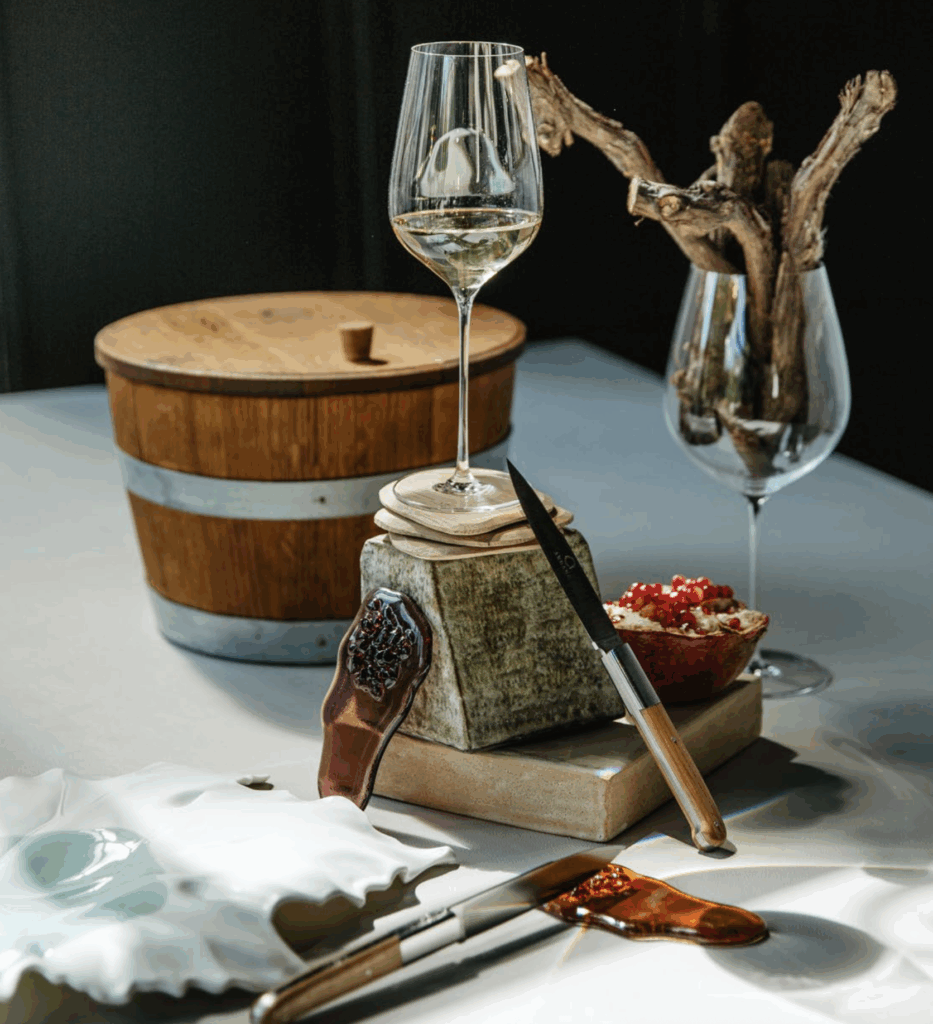 De cette rencontre entre gastronomie et artisanat d’art est née une série de pièces sculpturales, aussi utiles que poétiques. On y trouve un fumoir gastronomique, qui permet de sublimer viandes ou poissons à la maison, un vinaigrier inspiré des préparations du chef, ou encore un seau à vin “Vinum Dolium”, pensé pour accueillir une cuvée dans un écrin de chêne et de résine.