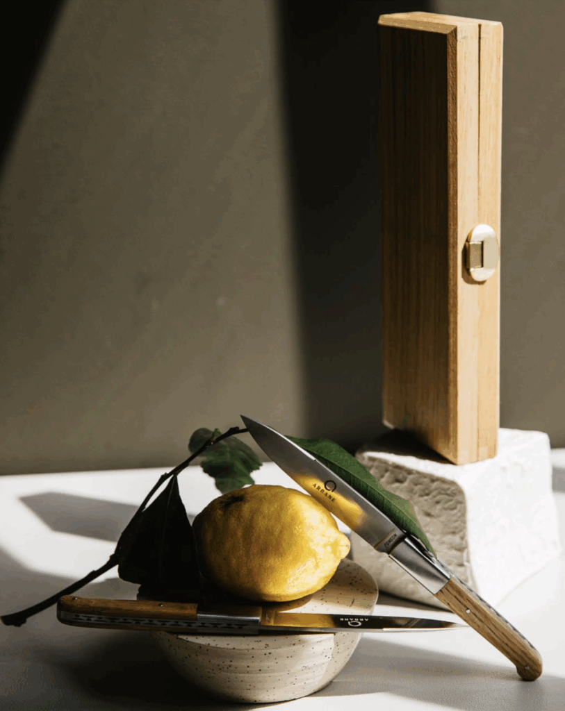 L’esprit de collaboration, cher à Philippe Mille, s’exprime aussi dans d’autres créations : les repose-couteaux “Éclat de lumière”, imaginés avec la Maison de vitraux Simon Marq et l’artiste Sarah Walbaum, rendent hommage aux reflets changeants du vignoble champenois ; tandis que le couteau Ponson Arbane, conçu avec la Maison Ponson, allie la finesse du geste coutelier à la chaleur du bois.