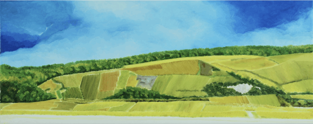 Dans cette approche, la couleur matière dialogue avec la couleur lumière — celle des écrans contemporains. Les collines, les forêts et les vignes de Champagne se transforment en espaces vibrants, unifiés par cette clarté particulière qui remplace le dessin traditionnel. Ce jeu subtil entre perception, abstraction et figuration crée une tension visuelle inédite : le regard oscille entre immersion et contemplation.