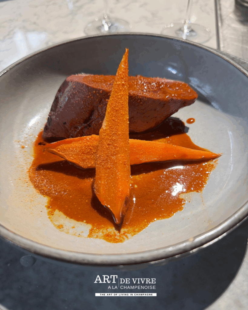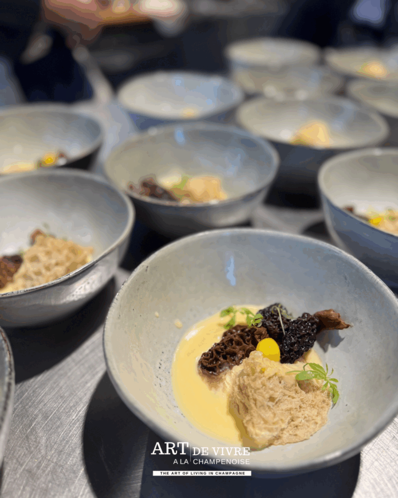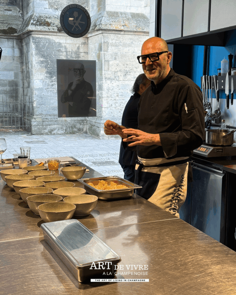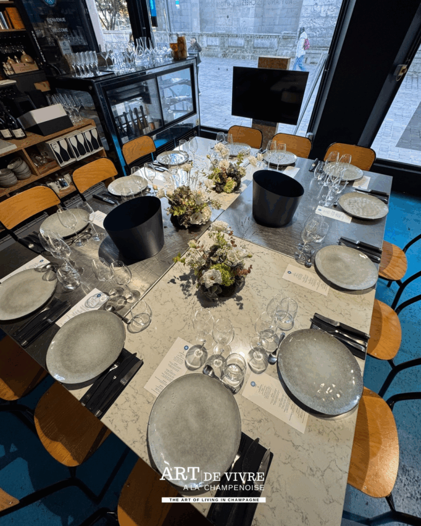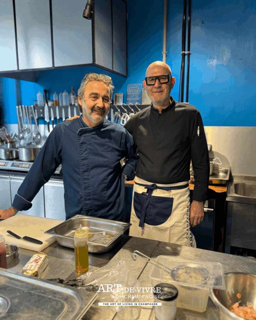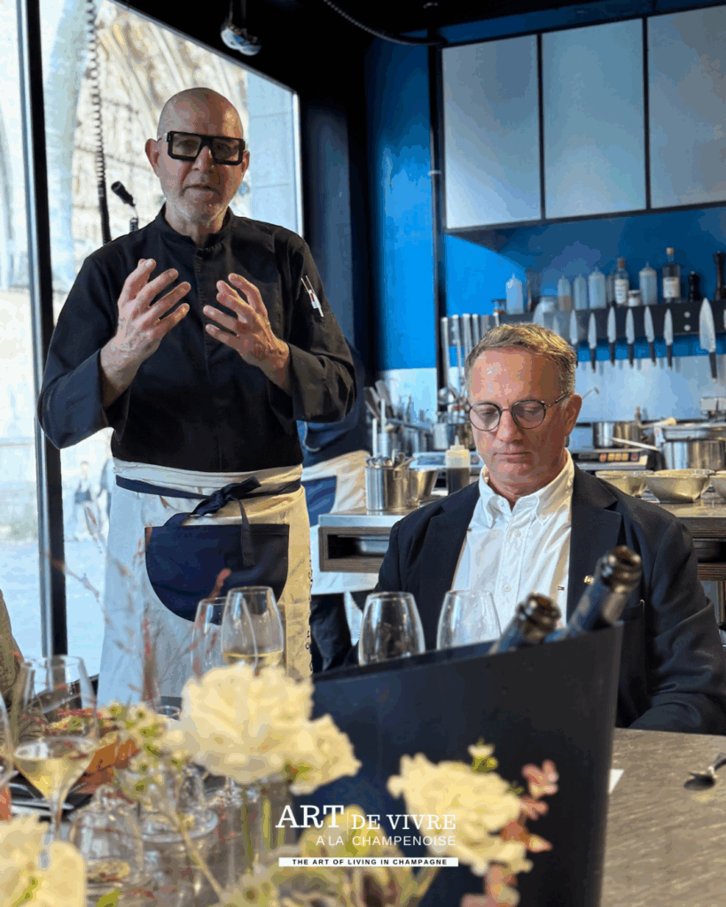 La dégustation s’est tenue à l’Atelier Au Piano des Chefs, à deux pas de la cathédrale de Reims. Un lieu dédié à la transmission, où le chef Eric Geoffroy (avec la présence exceptionnelle de Thierry Sidan) propose une cuisine attentive, en cohérence avec les vins. La lumière, le rythme calme, la proximité de la cuisine (l’atelier et les fourneaux sont ouverts) créaient les conditions d’une écoute fine, d’un moment de partage.