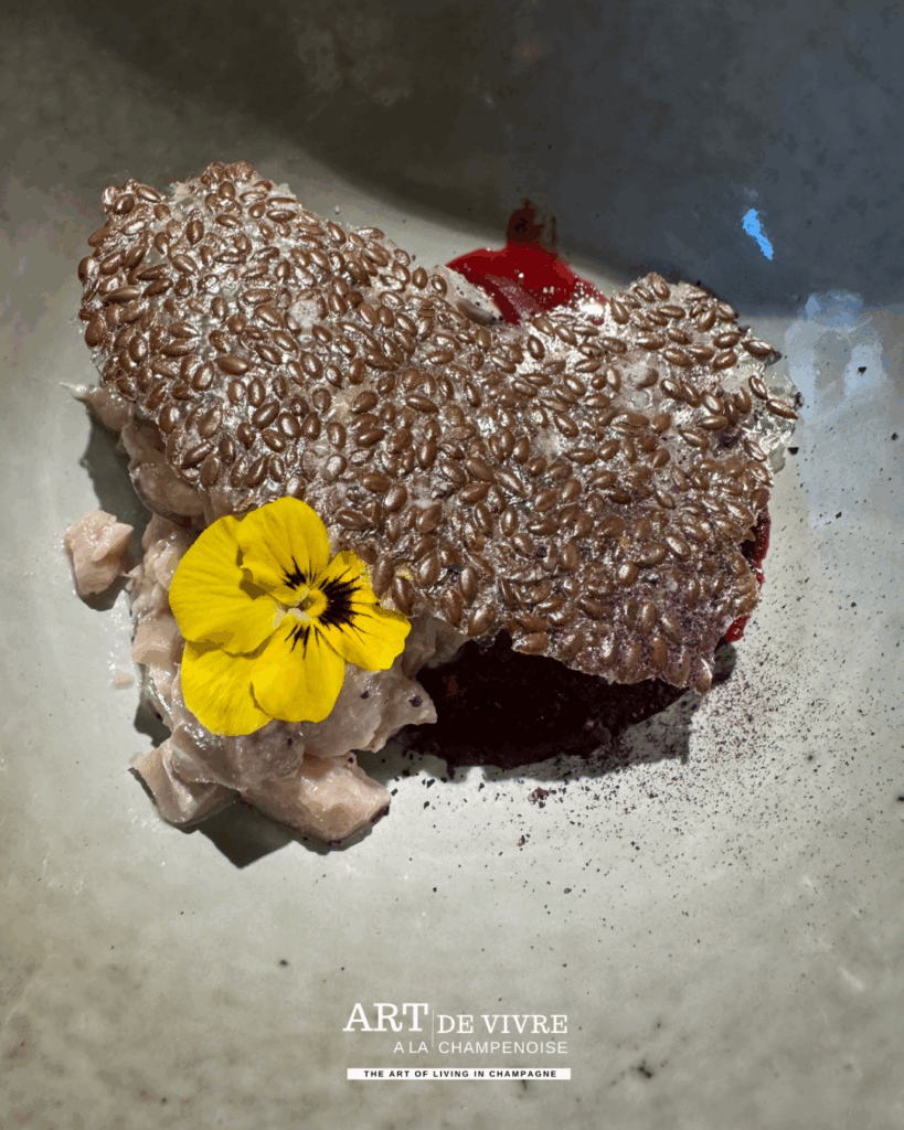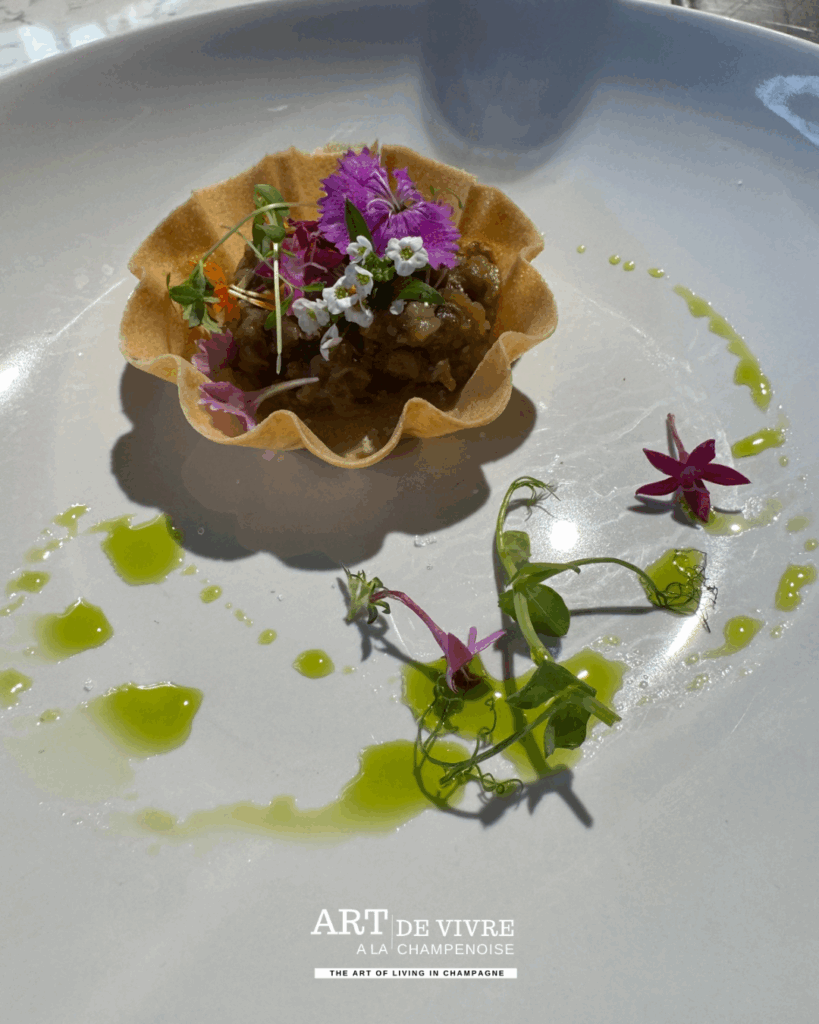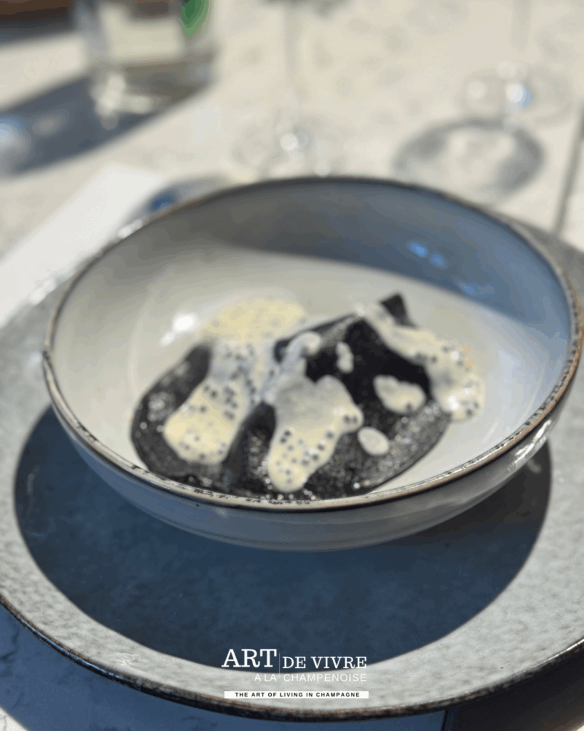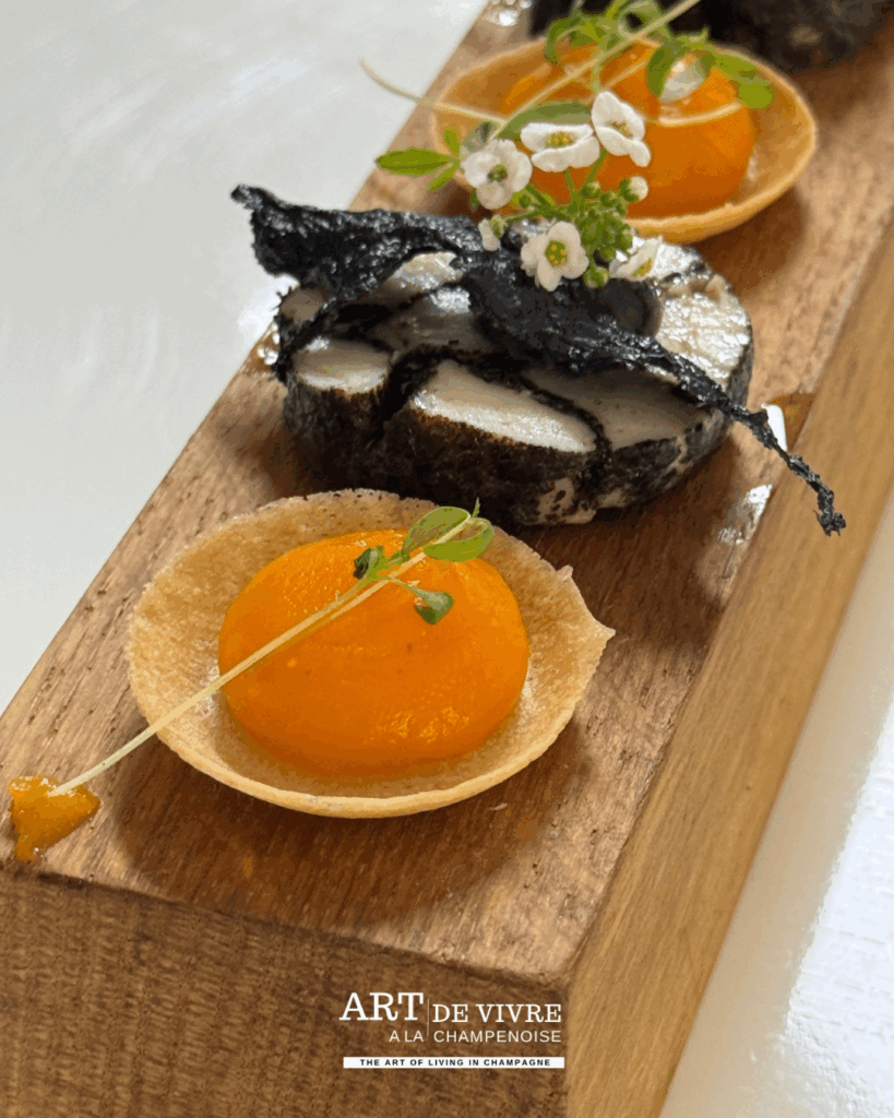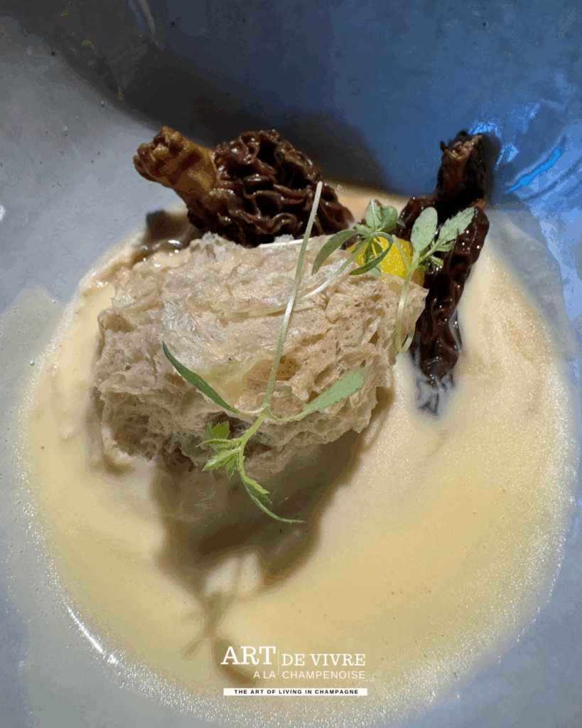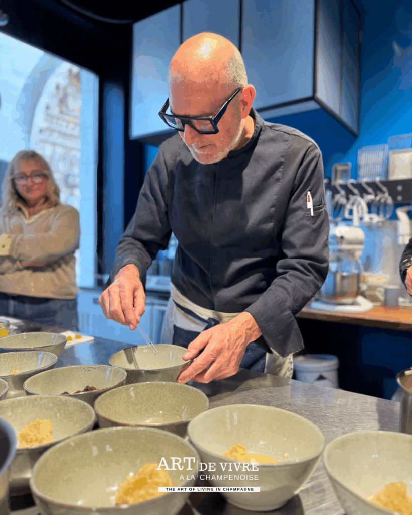 La dégustation s’est tenue à l’Atelier Au Piano des Chefs, à deux pas de la cathédrale de Reims. Un lieu dédié à la transmission, où le chef Eric Geoffroy (avec la présence exceptionnelle de Thierry Sidan) propose une cuisine attentive, en cohérence avec les vins. La lumière, le rythme calme, la proximité de la cuisine (l’atelier et les fourneaux sont ouverts) créaient les conditions d’une écoute fine, d’un moment de partage.