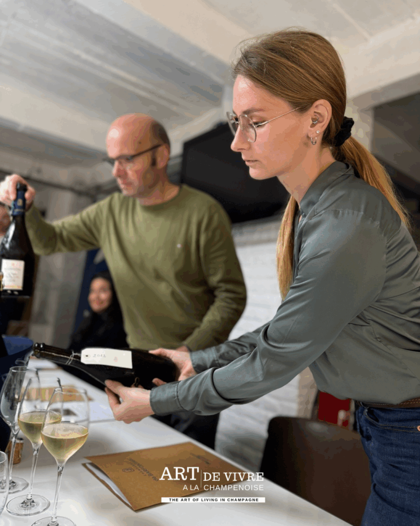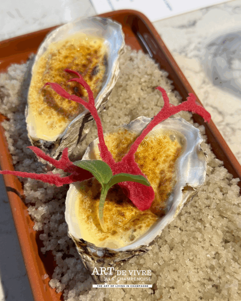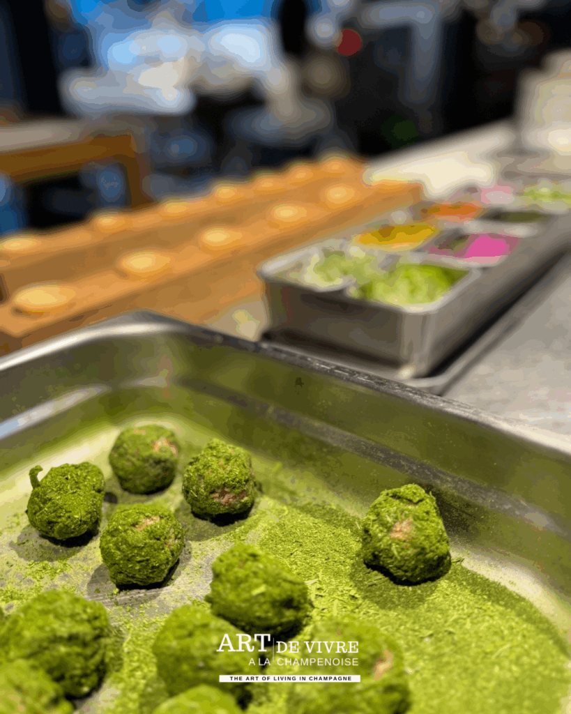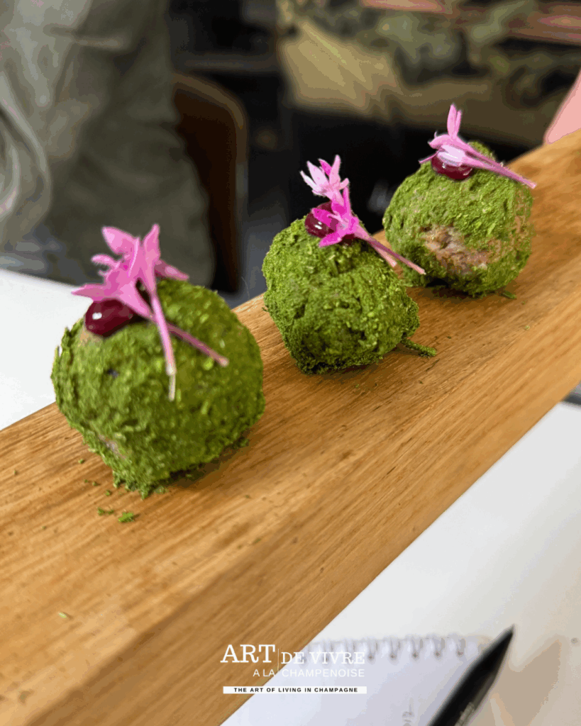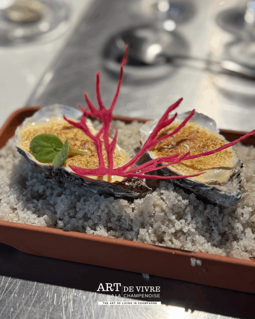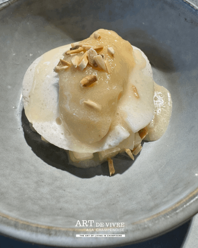 La dégustation s’est tenue à l’Atelier Au Piano des Chefs, à deux pas de la cathédrale de Reims. Un lieu dédié à la transmission, où le chef Eric Geoffroy (avec la présence exceptionnelle de Thierry Sidan) propose une cuisine attentive, en cohérence avec les vins. La lumière, le rythme calme, la proximité de la cuisine (l’atelier et les fourneaux sont ouverts) créaient les conditions d’une écoute fine, d’un moment de partage.