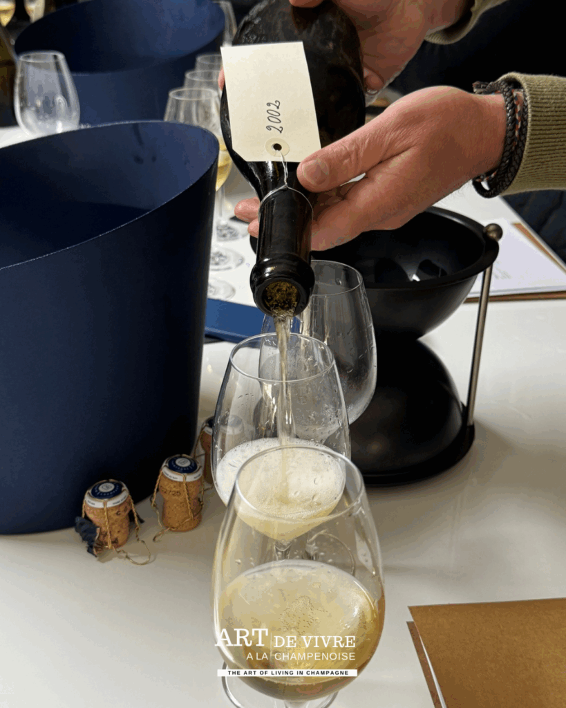 La verticale a débuté avec La Vigne au Roy Nature 2016, issue essentiellement de têtes de cuvée, vinifiée sans dosage. Le vin se présentait lumineux, avec des notes de fleur d’acacia, de pêche blanche, puis un glissement vers la pâte d’amande et la noisette fraîche. La bouche, dense mais droite, s’achevait sur une minéralité nette, presque saline. Une expression idéale pour accompagner huîtres et crustacés, sashimi, poissons crus ou préparations iodées délicates.