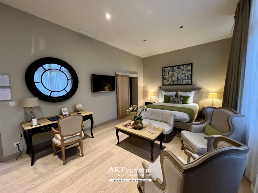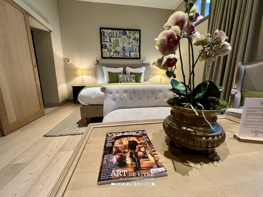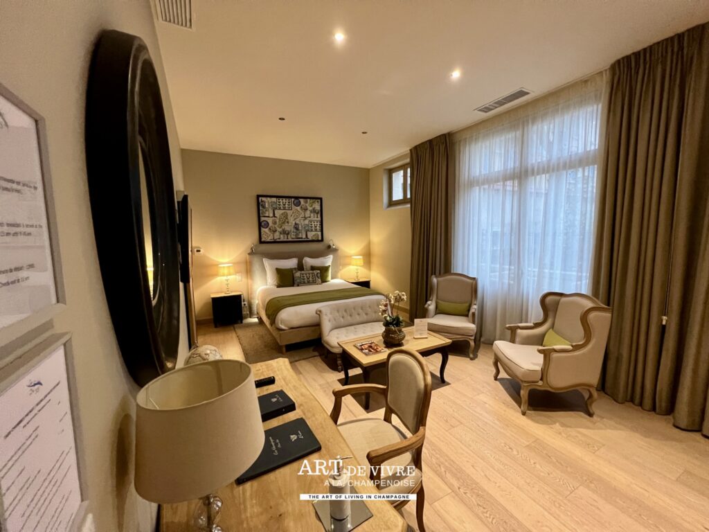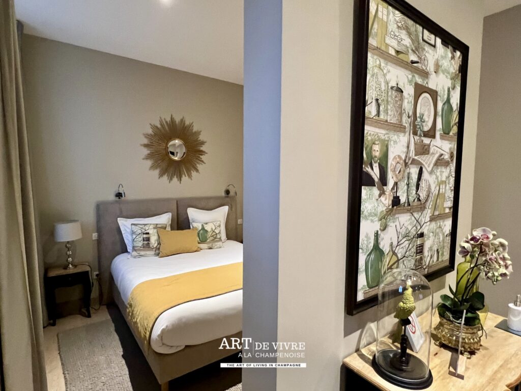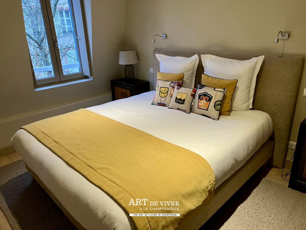 L’expérience proposée par la Maison De Venoge ne s’arrête pas à la visite. Elle se prolonge avec les Suites du 33, un hébergement confidentiel situé directement sur l’Avenue de Champagne. Ces suites offrent une immersion totale dans l’univers champenois. Chaque chambre a été pensée comme un écrin élégant, mêlant confort contemporain et références à l’histoire de la maison. Les volumes généreux, la lumière naturelle et les matériaux nobles créent une atmosphère à la fois raffinée et apaisante.